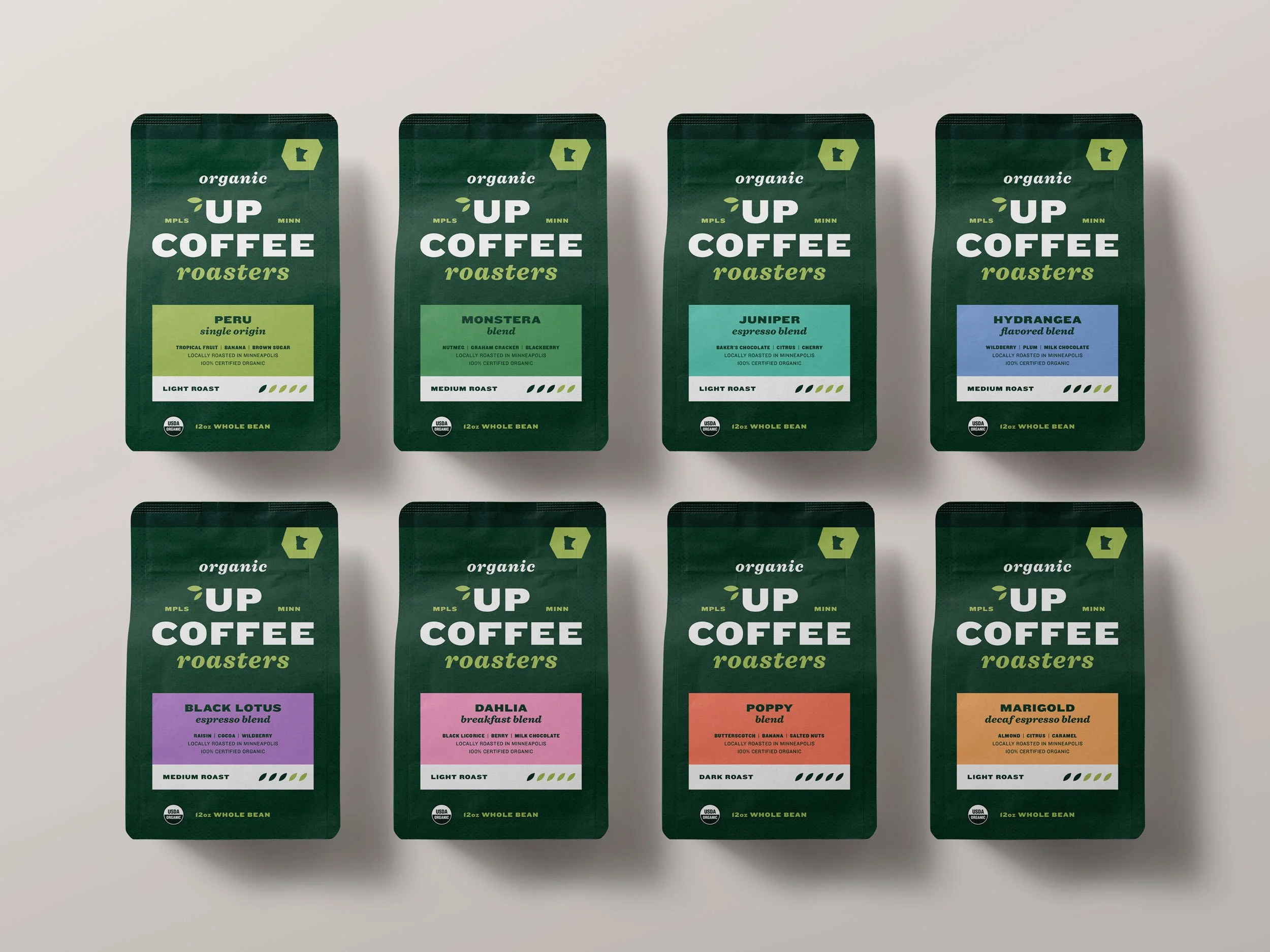Established in 1993, Up Coffee Roasters has over 30 years of experience in the coffee industry and is the region’s leading provider of organic, specialty-grade beans. They wanted a rebrand to appeal to a broader audience and hold their own against their competitors in a retail environment. They also wanted to incorporate an organic look and feel, highlighting that their coffees are always locally roasted in Minneapolis.